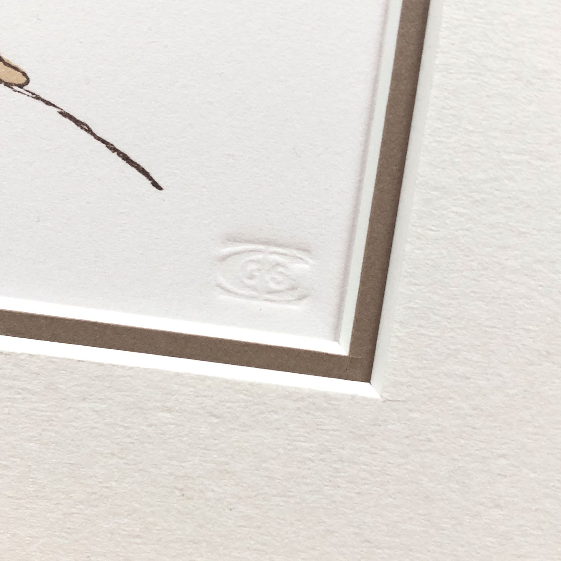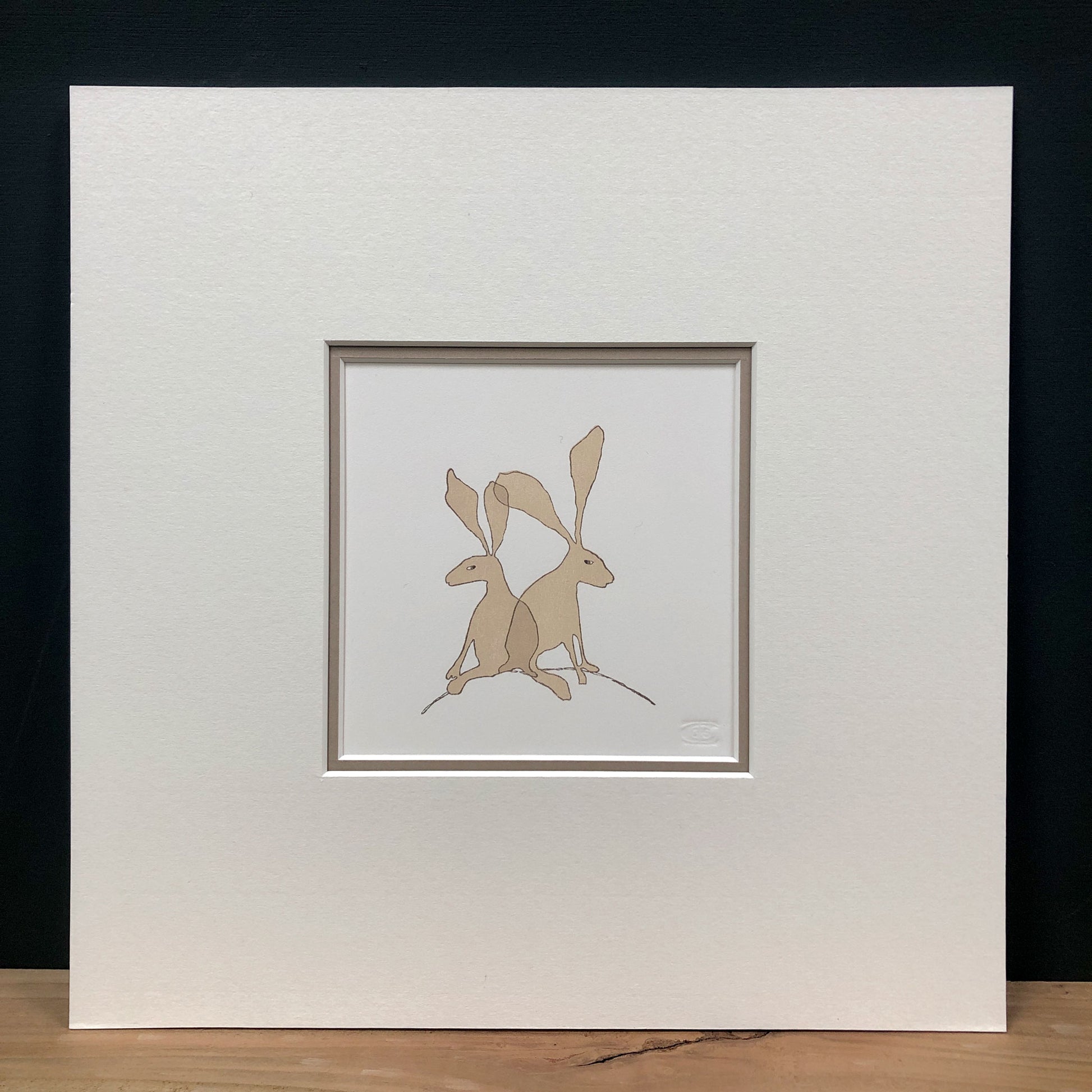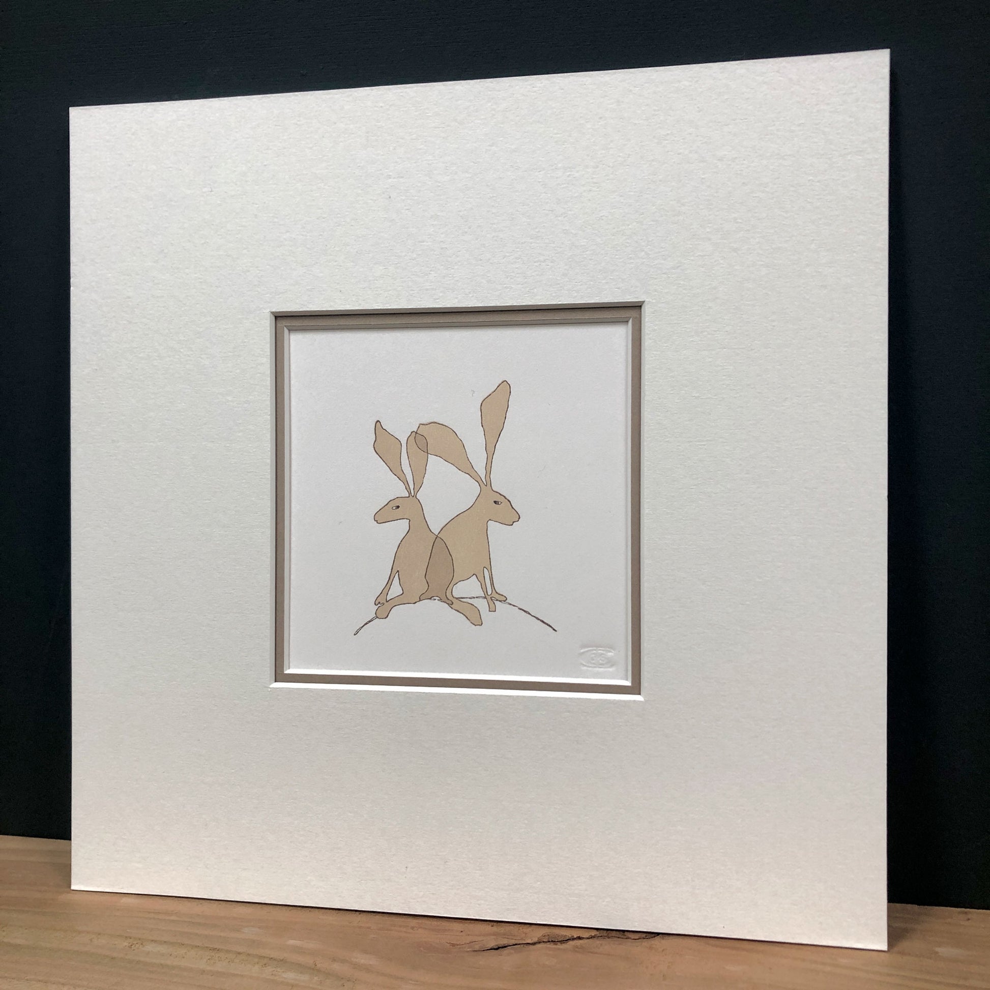 I've used the cherry blocks I carved for this design to create four different hare prints over time, but this was the first one. I created and carved a special seal to emboss into the corner of every hare print to mark the collaborative effort involved in its making.