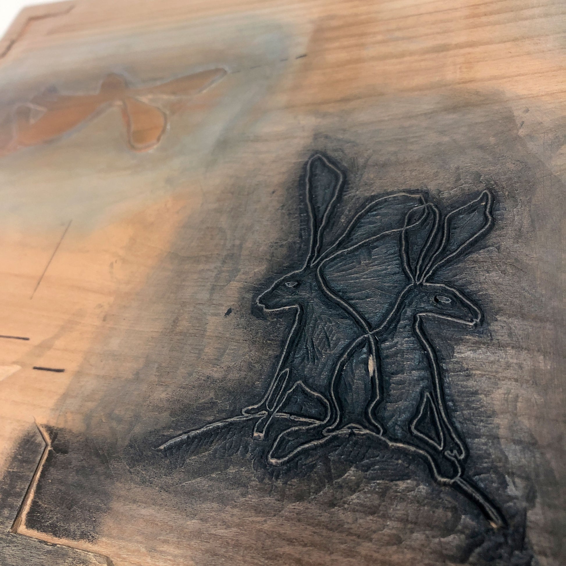 This original woodblock print of a pair of hares is based on a simple line drawing by my husband Ian. He's a furniture maker, and so our creative endeavours are both centred on wood.