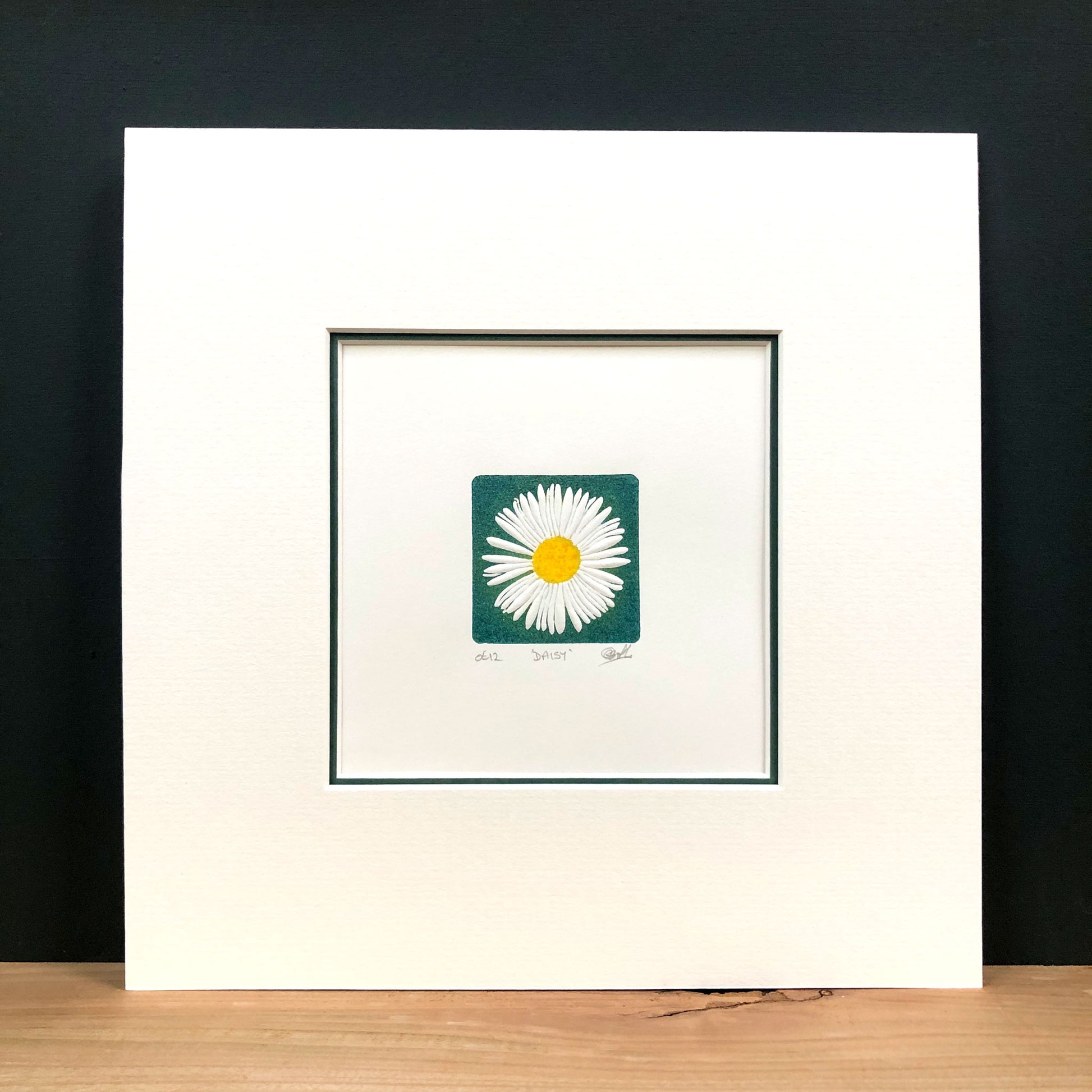 The image began with a photograph of a single daisy — chosen not for drama, but for its balance and quiet clarity. From that moment of noticing, the design was slowly translated into a hand-carved woodblock, then printed by hand.