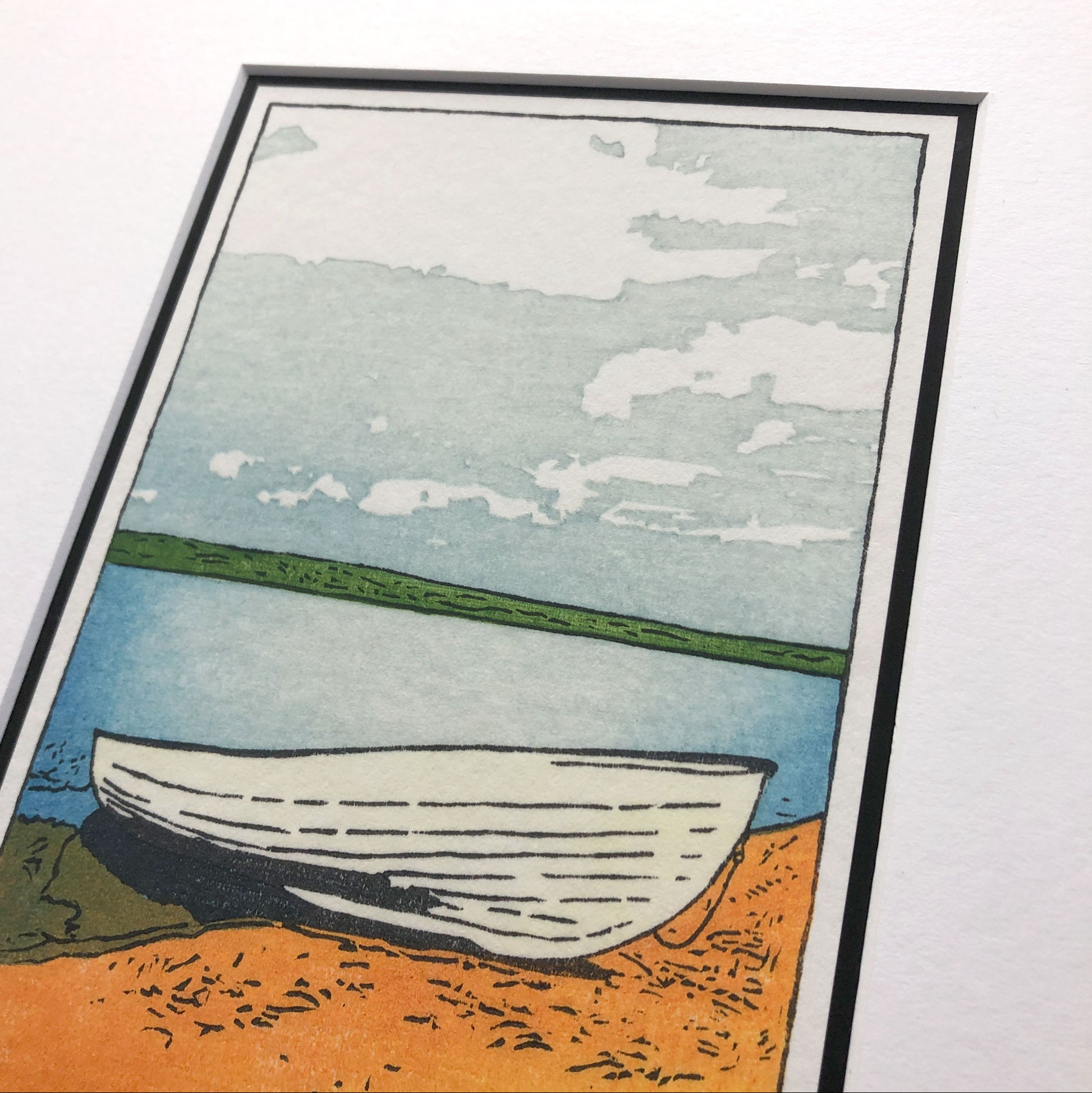 Escape to a moment of calm - with this design that's reminiscent of lazy summer days at the water's edge: a ready mounted giclée fine art print of my boat on the lakeshore design.