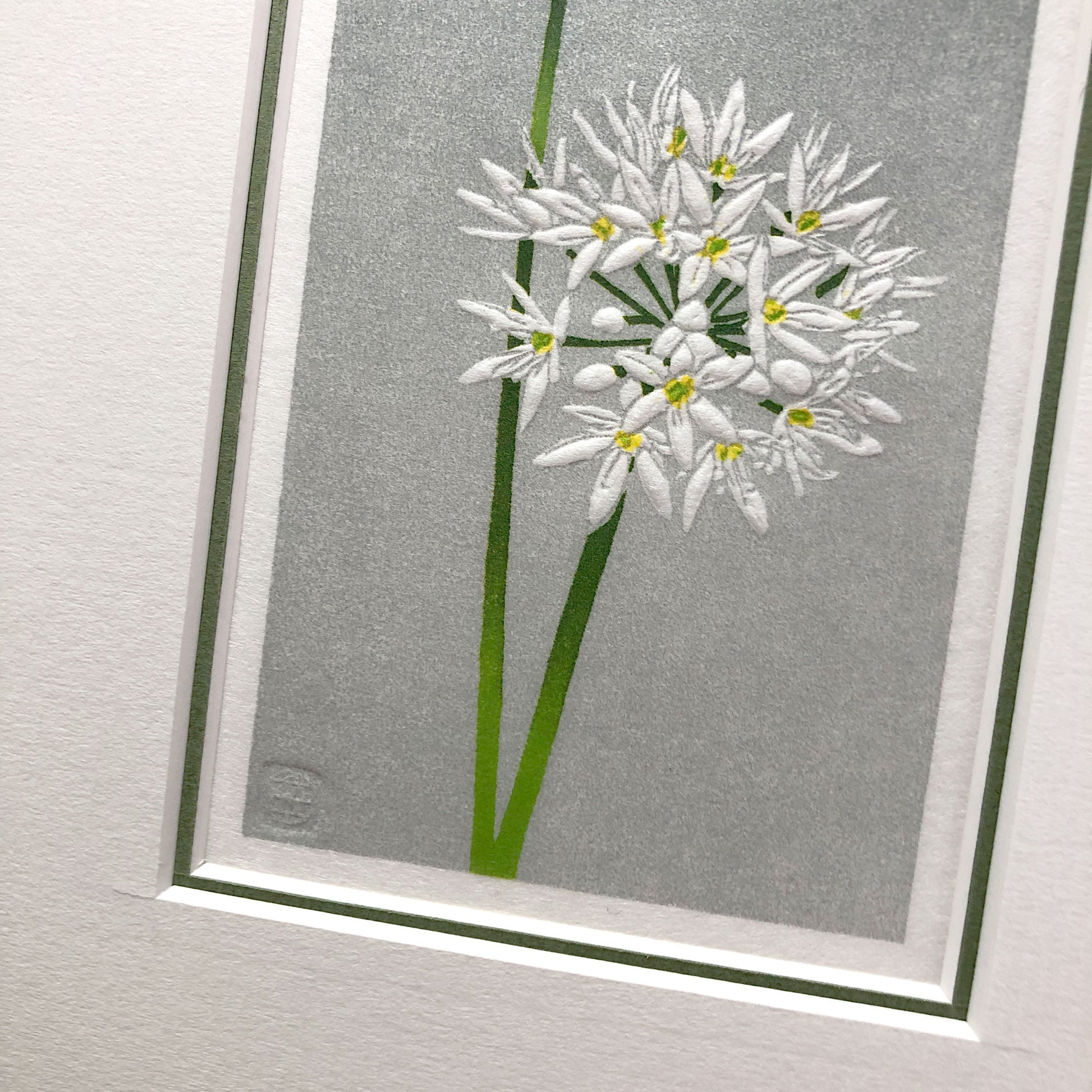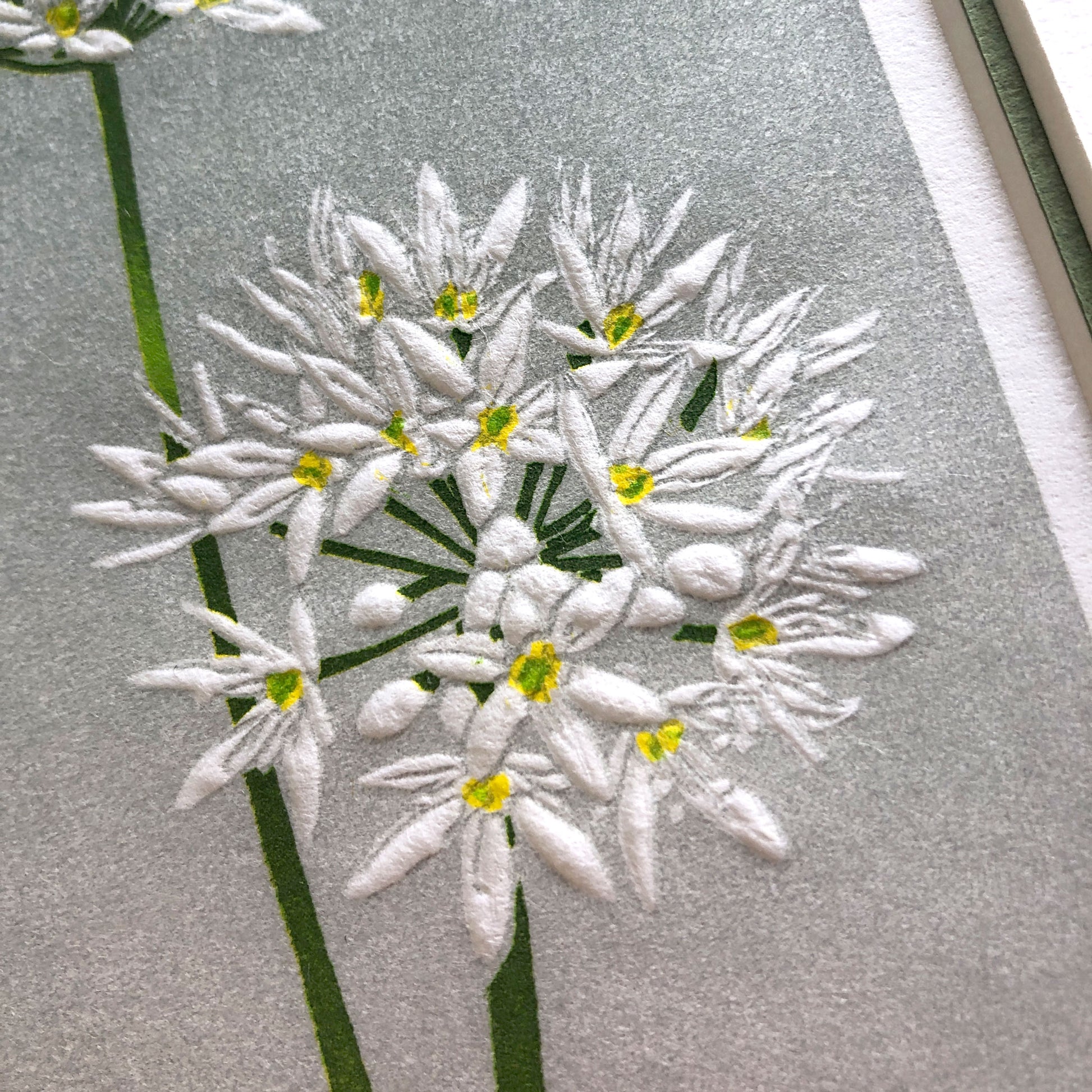 This hand-carved and printed design of wild garlic flowers was inspired by the sense of freshness these blooms bring.